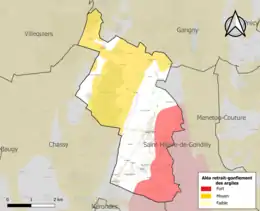 La commune est vulnérable au risque de mouvements de terrains constitué principalement du retrait-gonflement des sols argileux[15]. Cet aléa est susceptible d'engendrer des dommages importants aux bâtiments en cas d’alternance de périodes de sécheresse et de pluie. 60,4 % de la superficie communale est en aléa moyen ou fort (90 % au niveau départemental et 48,5 % au niveau national). Sur les 148 bâtiments dénombrés sur la commune en 2019, 20 sont en aléa moyen ou fort, soit 14 %, à comparer aux 83 % au niveau départemental et 54 % au niveau national. Une cartographie de l'exposition du territoire national au retrait gonflement des sols argileux est disponible sur le site du BRGM[16],[Carte 2].