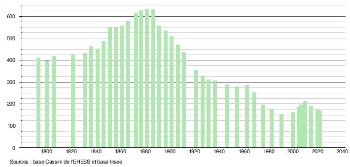 L'évolution du nombre d'habitants est connue à travers les recensements de la population effectués dans la commune depuis 1793. Pour les communes de moins de 10 000 habitants, une enquête de recensement portant sur toute la population est réalisée tous les cinq ans, les populations légales des années intermédiaires étant quant à elles estimées par interpolation ou extrapolation[20]. Pour la commune, le premier recensement exhaustif entrant dans le cadre du nouveau dispositif a été réalisé en 2004[21].