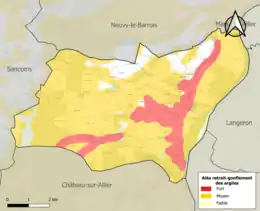 La commune est vulnérable au risque de mouvements de terrains constitué principalement du retrait-gonflement des sols argileux[16]. Cet aléa est susceptible d'engendrer des dommages importants aux bâtiments en cas d’alternance de périodes de sécheresse et de pluie. 89,6 % de la superficie communale est en aléa moyen ou fort (90 % au niveau départemental et 48,5 % au niveau national). Sur les 298 bâtiments dénombrés sur la commune en 2019, 249 sont en aléa moyen ou fort, soit 84 %, à comparer aux 83 % au niveau départemental et 54 % au niveau national. Une cartographie de l'exposition du territoire national au retrait gonflement des sols argileux est disponible sur le site du BRGM[17],[Carte 2].