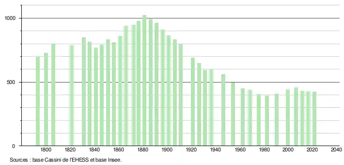 L'évolution du nombre d'habitants est connue à travers les recensements de la population effectués dans la commune depuis 1793. Pour les communes de moins de 10 000 habitants, une enquête de recensement portant sur toute la population est réalisée tous les cinq ans, les populations légales des années intermédiaires étant quant à elles estimées par interpolation ou extrapolation[21]. Pour la commune, le premier recensement exhaustif entrant dans le cadre du nouveau dispositif a été réalisé en 2006[22].
