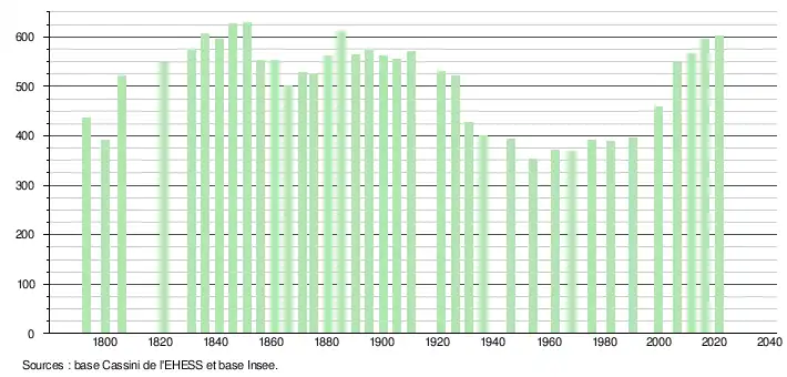 L'évolution du nombre d'habitants est connue à travers les recensements de la population effectués dans la commune depuis 1793. Pour les communes de moins de 10 000 habitants, une enquête de recensement portant sur toute la population est réalisée tous les cinq ans, les populations légales des années intermédiaires étant quant à elles estimées par interpolation ou extrapolation[17]. Pour la commune, le premier recensement exhaustif entrant dans le cadre du nouveau dispositif a été réalisé en 2006[18].