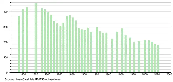 L'évolution du nombre d'habitants est connue à travers les recensements de la population effectués dans la commune depuis 1793. Pour les communes de moins de 10 000 habitants, une enquête de recensement portant sur toute la population est réalisée tous les cinq ans, les populations légales des années intermédiaires étant quant à elles estimées par interpolation ou extrapolation[26]. Pour la commune, le premier recensement exhaustif entrant dans le cadre du nouveau dispositif a été réalisé en 2006[27].