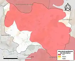 Le retrait-gonflement des sols argileux est susceptible d'engendrer des dommages importants aux bâtiments en cas d’alternance de périodes de sécheresse et de pluie. 77,2 % de la superficie communale est en aléa moyen ou fort (54,2 % au niveau départemental et 48,5 % au niveau national). Sur les 118 bâtiments dénombrés sur la commune en 2019, 94 sont en aléa moyen ou fort, soit 80 %, à comparer aux 57 % au niveau départemental et 54 % au niveau national. Une cartographie de l'exposition du territoire national au retrait gonflement des sols argileux est disponible sur le site du BRGM[12],[Carte 2].