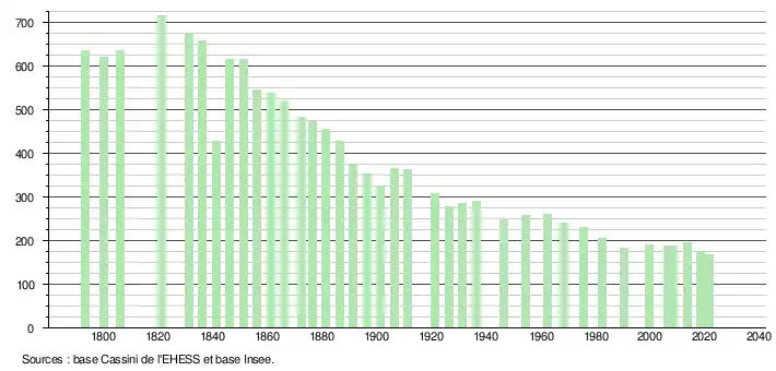 L'évolution du nombre d'habitants est connue à travers les recensements de la population effectués dans la commune depuis 1793. Pour les communes de moins de 10 000 habitants, une enquête de recensement portant sur toute la population est réalisée tous les cinq ans, les populations légales des années intermédiaires étant quant à elles estimées par interpolation ou extrapolation[15]. Pour la commune, le premier recensement exhaustif entrant dans le cadre du nouveau dispositif a été réalisé en 2008[16].