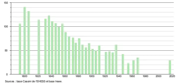 L'évolution du nombre d'habitants est connue à travers les recensements de la population effectués dans la commune depuis 1793. Pour les communes de moins de 10 000 habitants, une enquête de recensement portant sur toute la population est réalisée tous les cinq ans, les populations légales des années intermédiaires étant quant à elles estimées par interpolation ou extrapolation[2]. Pour la commune, le premier recensement exhaustif entrant dans le cadre du nouveau dispositif a été réalisé en 2007[3].
