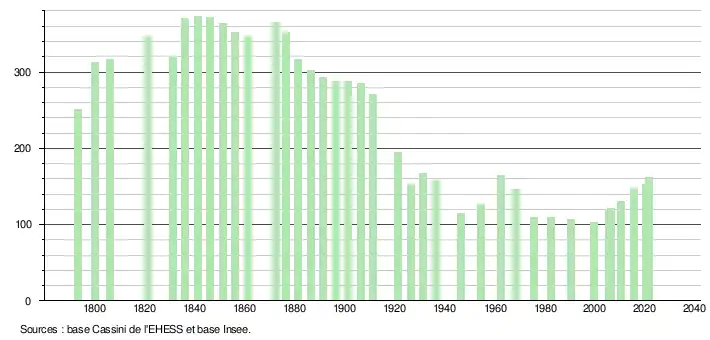 L'évolution du nombre d'habitants est connue à travers les recensements de la population effectués dans la commune depuis 1793. Pour les communes de moins de 10 000 habitants, une enquête de recensement portant sur toute la population est réalisée tous les cinq ans, les populations légales des années intermédiaires étant quant à elles estimées par interpolation ou extrapolation[18]. Pour la commune, le premier recensement exhaustif entrant dans le cadre du nouveau dispositif a été réalisé en 2005[19].