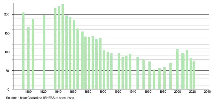 L'évolution du nombre d'habitants est connue à travers les recensements de la population effectués dans la commune depuis 1793. Pour les communes de moins de 10 000 habitants, une enquête de recensement portant sur toute la population est réalisée tous les cinq ans, les populations légales des années intermédiaires étant quant à elles estimées par interpolation ou extrapolation[23]. Pour la commune, le premier recensement exhaustif entrant dans le cadre du nouveau dispositif a été réalisé en 2007[24].