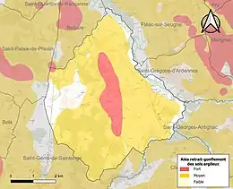 Le retrait-gonflement des sols argileux est susceptible d'engendrer des dommages importants aux bâtiments en cas d’alternance de périodes de sécheresse et de pluie. 84,3 % de la superficie communale est en aléa moyen ou fort (54,2 % au niveau départemental et 48,5 % au niveau national). Sur les 291 bâtiments dénombrés sur la commune en 2019, 208 sont en aléa moyen ou fort, soit 71 %, à comparer aux 57 % au niveau départemental et 54 % au niveau national. Une cartographie de l'exposition du territoire national au retrait gonflement des sols argileux est disponible sur le site du BRGM[13],[Carte 2].