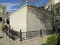 La façade principale de la mosquée est asymétrique et sa composition rigide et volumineuse est soulignée par une porte d'entrée de type classique.