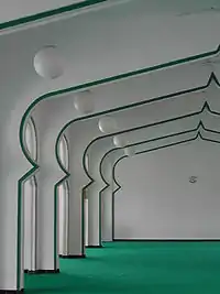 Au sol, la moquette à dominante verte est couverte de motifs représentant des colonnades dorées pointant vers La Mecque. Construit selon les indications d'un navigateur de passage, légèrement modifié depuis, le mihrab est situé dans l'axe de l'entrée donnant sur la rue.