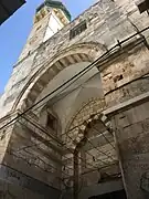 La mosquée d'Omar, située de l'autre côté de l'église du Saint-Sépulcre, possède un minaret quasi identique[2]. Les deux minarets ont été conçus ensemble : la ligne imaginaire qui les relie traverse la porte du tombeau de Jésus, et les deux minarets, situés à équidistance tombeau[2], ont la même hauteur bien que leurs bases soient sur deux niveaux différents[3]. Cormac Murphy-O'Connor affirme que les dirigeants mamelouks ont ainsi pu avoir l'intention d'« invalider le Saint-Sépulcre », car la croyance islamique affirme que Jésus n'est pas mort sur la croix mais qu'il a été élevé au ciel de son vivant par Allah[3].