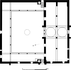 L'accès à la salle de prières se fait par une arcade triple au centre de la façade Nord de l'édifice. Elle est surmontée de deux fenêtres à arc brisé encadrant une fenêtre ronde. La salle de prières mesure environ 18 m sur 48 m. Elle est divisée en deux longitudinalement par quatre énormes colonnes de granite noir[1]: trois d'entre elles supportent un chapiteau à stalactites, tandis que la quatrième est surmontée d'un chapiteau composite romain en remploi[2]. La partie médiane, dans l'axe de la porte et du mihrab est couverte par deux coupoles portées par des arcs de briques. Celle du mihrab est d'un diamètre légèrement inférieur à la première[2]. La lumière entre par une série de fenêtres disposées à intervalles irréguliers aux deux tiers de la hauteur des murs.