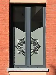 La partie circulaire orientée vers l'est est percée de sept paires de fenêtres rectangulaires au rez-de-chaussée et d'autant de fenêtres à l'étage, chacune étant surmontée d'un tympan plat. Les allèges des fenêtres et les tympans sont couverts d'un enduit de couleur rose. Cette partie est surmontée de structures en gradins évoquant des merlons.