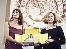 Jane Campion recevant son prix des mains d'Anjelica Huston.