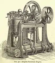 Brayton breveta son moteur en 1872[1]. À l'origine, le moteur Brayton est un moteur à gaz ; son rendement est supérieur à celui du moteur Hugon, mais moins bon que celui d'un moteur Otto classique[2]. En 1874 Brayton dépose un brevet pour un mécanisme d'admission qui lui permet d'utiliser des carburants liquides comme le pétrole brut ou le pétrole lampant[3]. En 1876, il commercialise son moteur, et en 1878 le présente lors de l’Exposition universelle de 1878 à Paris. De par son rendement médiocre, le moteur Brayton n'a pas joué un grand rôle dans l'industrie américaine naissante ; seule l’admission du carburant connut une certaine postérité, et cela grâce au moteur Diesel, puisque faute d'un mécanisme d'injection convenable, Rudolf Diesel dut se rabattre sur l'admission à la Brayton, mais avec des pressions nettement plus élevées[4].