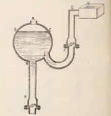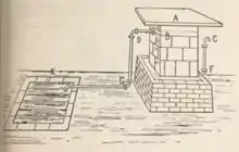 Le dispositif est hermétiquement fermé et ne communique avec l'extérieur que par les tubes C et D. Ces tubes sont équipés de vannes qui agissent en sens opposés. L'appareil contient de l'eau jusqu'à la ligne B ; le reste étant de l'air à pression atmosphérique. La surface A est en métal fin et noirci. La surface A étant chauffée par les rayons solaires, l'air se dilate et appuie sur l'eau qui sort par le tube C. La surface A est alors mise à l'abri du soleil par un moyen quelconque, et l'air qui s'est dilaté se condense. L'eau sort par le tube C forme un vide qui est immédiatement rempli d'eau du réservoir K.