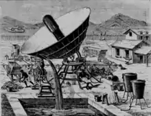 L'ingénieur américain Frank Shuman, a fait des expériences similaires près de Philadelphie, puis a installé d'importants appareils en Égypte. En 1910, il a mis au point un appareil sans réflecteur pour concentrer les rayons du soleil[22]. L'absorbeur consistait en un récipient noirci, recouvert de deux lames de verre laissant un espace d'un pouce (2,54 cm) entre elles. Le récipient était orienté de telle sorte qu'à midi, les rayons du soleil soient perpendiculaires au verre; il n'y avait aucun appareil pour suivre la course du soleil ; l'appareil était ajusté que toutes les trois semaines[23].