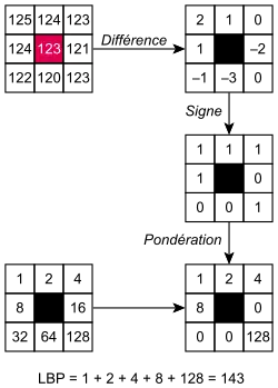 où est la fonction de Heaviside. Il ne reste alors qu'à pondérer chaque différence avec un facteur de la forme pour obtenir un code unique, aboutissant au descripteur du motif binaire local en un point :
