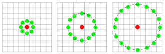 Selon l'application visée l'implémentation des voisinages peut être différente. Dans la définition générale donnée ci-dessus, les coordonnées des P points du voisinage de est donnée par: