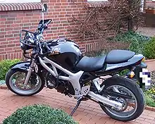 Une machine de moto-école : une Suzuki SV 650 parée des renforts en aciers la protégeant en cas de chute.