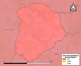Le retrait-gonflement des sols argileux est susceptible d'engendrer des dommages importants aux bâtiments en cas d’alternance de périodes de sécheresse et de pluie. La totalité de la commune est en aléa moyen ou fort (67,4 % au niveau départemental et 48,5 % au niveau national). Sur les 40 bâtiments dénombrés sur la commune en 2019, 40 sont en aléa moyen ou fort, soit 100 %, à comparer aux 84 % au niveau départemental et 54 % au niveau national. Une cartographie de l'exposition du territoire national au retrait gonflement des sols argileux est disponible sur le site du BRGM[18],[Carte 2].