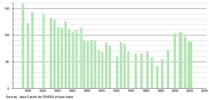 L'évolution du nombre d'habitants est connue à travers les recensements de la population effectués dans la commune depuis 1793. Pour les communes de moins de 10 000 habitants, une enquête de recensement portant sur toute la population est réalisée tous les cinq ans, les populations légales des années intermédiaires étant quant à elles estimées par interpolation ou extrapolation[20]. Pour la commune, le premier recensement exhaustif entrant dans le cadre du nouveau dispositif a été réalisé en 2008[21].