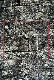- Un des cadrans est sur une pierre de remploi ; l'artisan qui a réutilisé la pierre l'a posée avec le cadran canonial inversé.