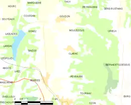 Les communes les plus proches[Note 1] sont[3] : Clarac (1,1 km), Goudon (1,7 km), Gonez (1,8 km), Sinzos (1,9 km), Coussan (2,9 km), Bordes (3,0 km), Peyraube (3,1 km), Thuy (3,4 km).