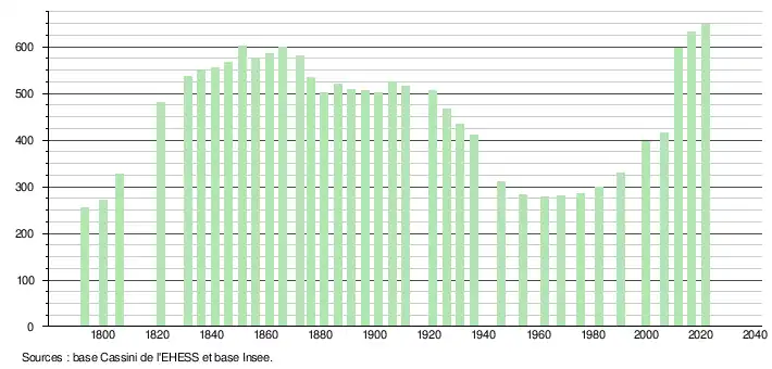 L'évolution du nombre d'habitants est connue à travers les recensements de la population effectués dans la commune depuis 1793. Pour les communes de moins de 10 000 habitants, une enquête de recensement portant sur toute la population est réalisée tous les cinq ans, les populations légales des années intermédiaires étant quant à elles estimées par interpolation ou extrapolation[25]. Pour la commune, le premier recensement exhaustif entrant dans le cadre du nouveau dispositif a été réalisé en 2006[26].