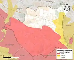 Le retrait-gonflement des sols argileux est susceptible d'engendrer des dommages importants aux bâtiments en cas d’alternance de périodes de sécheresse et de pluie. 66,5 % de la superficie communale est en aléa moyen ou fort (67,4 % au niveau départemental et 48,5 % au niveau national). Sur les 351 bâtiments dénombrés sur la commune en 2019, 219 sont en aléa moyen ou fort, soit 62 %, à comparer aux 81 % au niveau départemental et 54 % au niveau national. Une cartographie de l'exposition du territoire national au retrait gonflement des sols argileux est disponible sur le site du BRGM[19],[Carte 3].