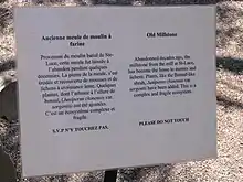 - Construction en pierres, 17 mètres par 10 mètres, quatre lucarnes en façade et deux lucarnes à l'arrière. Le moulin abritait le mécanisme et le logis du meunier. Le logis était du côté est du moulin.