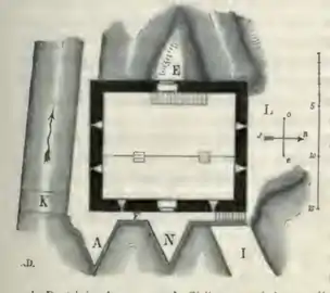 Voici le plan du rez-de-chaussée et de son entourage. Deux éperons fort aigus (A et N) coupent le courant et dirigent les eaux dans deux vannes; les embouchures d'aval sont formées chacune de deux ouvertures à linteau sur consoles; une meurtrière, percée au-dessous du rez-de-chaussée, protège chaque embouchure. Le Dropt ayant été canalisé, une écluse passe au sud du moulin. Le déversoir est en I.