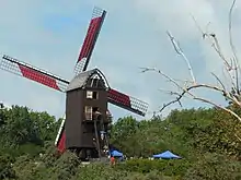Moulin avec des voiles avec ses voiles et des visiteurs.