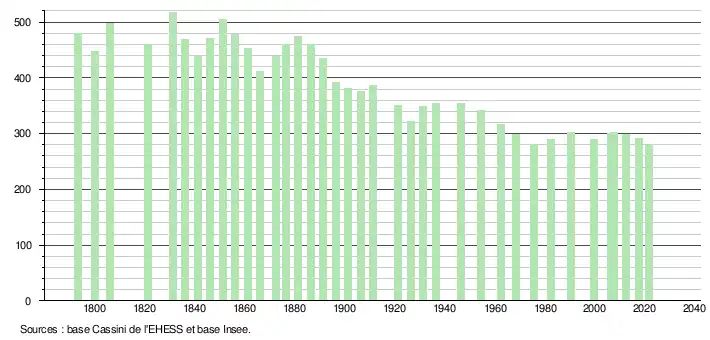 L'évolution du nombre d'habitants est connue à travers les recensements de la population effectués dans la commune depuis 1793. Pour les communes de moins de 10 000 habitants, une enquête de recensement portant sur toute la population est réalisée tous les cinq ans, les populations légales des années intermédiaires étant quant à elles estimées par interpolation ou extrapolation[19]. Pour la commune, le premier recensement exhaustif entrant dans le cadre du nouveau dispositif a été réalisé en 2007[20].