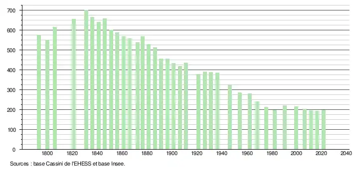 L'évolution du nombre d'habitants est connue à travers les recensements de la population effectués dans la commune depuis 1793. Pour les communes de moins de 10 000 habitants, une enquête de recensement portant sur toute la population est réalisée tous les cinq ans, les populations légales des années intermédiaires étant quant à elles estimées par interpolation ou extrapolation[21]. Pour la commune, le premier recensement exhaustif entrant dans le cadre du nouveau dispositif a été réalisé en 2006[22].