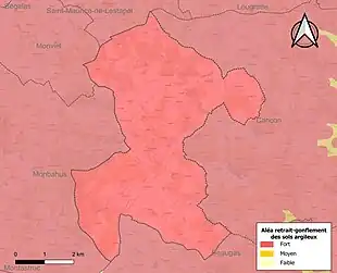 Le retrait-gonflement des sols argileux est susceptible d'engendrer des dommages importants aux bâtiments en cas d’alternance de périodes de sécheresse et de pluie[19]. La totalité de la commune est en aléa moyen ou fort (91,8 % au niveau départemental et 48,5 % au niveau national)[Carte 2]. Depuis le , en application de la loi ELAN, différentes contraintes s'imposent aux vendeurs, maîtres d'ouvrages ou constructeurs de biens situés dans une zone classée en aléa moyen ou fort[Note 2],[20].