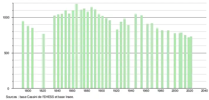 L'évolution du nombre d'habitants est connue à travers les recensements de la population effectués dans la commune depuis 1793. Pour les communes de moins de 10 000 habitants, une enquête de recensement portant sur toute la population est réalisée tous les cinq ans, les populations légales des années intermédiaires étant quant à elles estimées par interpolation ou extrapolation[39]. Pour la commune, le premier recensement exhaustif entrant dans le cadre du nouveau dispositif a été réalisé en 2008[40].