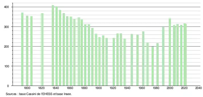 L'évolution du nombre d'habitants est connue à travers les recensements de la population effectués dans la commune depuis 1793. Pour les communes de moins de 10 000 habitants, une enquête de recensement portant sur toute la population est réalisée tous les cinq ans, les populations légales des années intermédiaires étant quant à elles estimées par interpolation ou extrapolation[26]. Pour la commune, le premier recensement exhaustif entrant dans le cadre du nouveau dispositif a été réalisé en 2005[27].