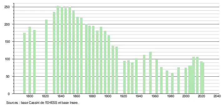 L'évolution du nombre d'habitants est connue à travers les recensements de la population effectués dans la commune depuis 1793. Pour les communes de moins de 10 000 habitants, une enquête de recensement portant sur toute la population est réalisée tous les cinq ans, les populations légales des années intermédiaires étant quant à elles estimées par interpolation ou extrapolation[16]. Pour la commune, le premier recensement exhaustif entrant dans le cadre du nouveau dispositif a été réalisé en 2004[17].