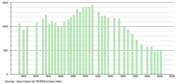 L'évolution du nombre d'habitants est connue à travers les recensements de la population effectués dans la commune depuis 1793. Pour les communes de moins de 10 000 habitants, une enquête de recensement portant sur toute la population est réalisée tous les cinq ans, les populations légales des années intermédiaires étant quant à elles estimées par interpolation ou extrapolation[19]. Pour la commune, le premier recensement exhaustif entrant dans le cadre du nouveau dispositif a été réalisé en 2006[20].