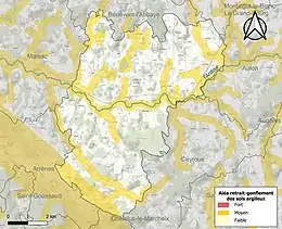 Le retrait-gonflement des sols argileux est susceptible d'engendrer des dommages importants aux bâtiments en cas d’alternance de périodes de sécheresse et de pluie. 31,8 % de la superficie communale est en aléa moyen ou fort (33,6 % au niveau départemental et 48,5 % au niveau national). Sur les 413 bâtiments dénombrés sur la commune en 2019, 80 sont en aléa moyen ou fort, soit 19 %, à comparer aux 25 % au niveau départemental et 54 % au niveau national. Une cartographie de l'exposition du territoire national au retrait gonflement des sols argileux est disponible sur le site du BRGM[16],[Carte 2].