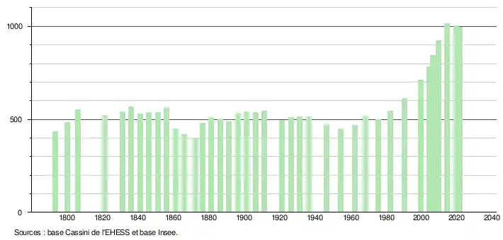 L'évolution du nombre d'habitants est connue à travers les recensements de la population effectués dans la commune depuis 1793. Pour les communes de moins de 10 000 habitants, une enquête de recensement portant sur toute la population est réalisée tous les cinq ans, les populations légales des années intermédiaires étant quant à elles estimées par interpolation ou extrapolation[33]. Pour la commune, le premier recensement exhaustif entrant dans le cadre du nouveau dispositif a été réalisé en 2004[34].