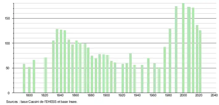 L'évolution du nombre d'habitants est connue à travers les recensements de la population effectués dans la commune depuis 1793. Pour les communes de moins de 10 000 habitants, une enquête de recensement portant sur toute la population est réalisée tous les cinq ans, les populations légales des années intermédiaires étant quant à elles estimées par interpolation ou extrapolation[42]. Pour la commune, le premier recensement exhaustif entrant dans le cadre du nouveau dispositif a été réalisé en 2007[43].