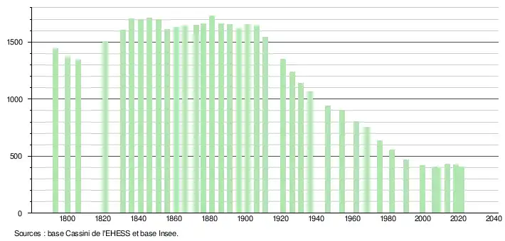 L'évolution du nombre d'habitants est connue à travers les recensements de la population effectués dans la commune depuis 1793. Pour les communes de moins de 10 000 habitants, une enquête de recensement portant sur toute la population est réalisée tous les cinq ans, les populations légales des années intermédiaires étant quant à elles estimées par interpolation ou extrapolation[19]. Pour la commune, le premier recensement exhaustif entrant dans le cadre du nouveau dispositif a été réalisé en 2008[20].