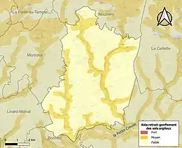 Le retrait-gonflement des sols argileux est susceptible d'engendrer des dommages importants aux bâtiments en cas d’alternance de périodes de sécheresse et de pluie. 27,1 % de la superficie communale est en aléa moyen ou fort (33,6 % au niveau départemental et 48,5 % au niveau national). Sur les 457 bâtiments dénombrés sur la commune en 2019, 30 sont en aléa moyen ou fort, soit 7 %, à comparer aux 25 % au niveau départemental et 54 % au niveau national. Une cartographie de l'exposition du territoire national au retrait gonflement des sols argileux est disponible sur le site du BRGM[17],[Carte 2].