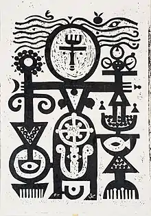 C'est ainsi qu'apparaissent des courants d'art iranien moderne qui allient modernisation et expressivité individuelle, et incluent dans l'œuvre des éléments, des motifs, du passé : le mouvement Saqqa-Khaneh est le plus important d'entre eux[4]. Il est informellement impulsé dans les années 1950 et 1960 par les artistes Hossein Zenderoudi (en) (1937-), Parviz Tanavoli (1937-), Faramarz Pilaram (1938-1983), Massoud Arabshahi (en) (1935-), Mansour Ghandriz (1936-1966), Nasser Oveisi (1934-), Sadeq Tabrizi (1939-) et Zhazeh Tabatabai (1928-)[5],[6],[alpha 2]. Ces artistes ont tous fréquenté l'École des Arts Décoratifs de Téhéran, tout juste créée en 1961 et qui a formé de nombreux « peintres, sculpteurs et designers modernes qui ont joué un rôle crucial dans le développement de l’art visuel contemporain iranien »[4]. Les professeurs, iraniens et étrangers, encouragent leurs élèves à trouver dans les symboles, expressions idiomatiques et héritages locaux des sources d'inspiration[4],[7].