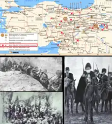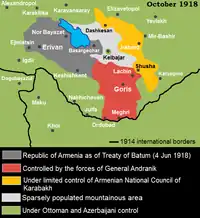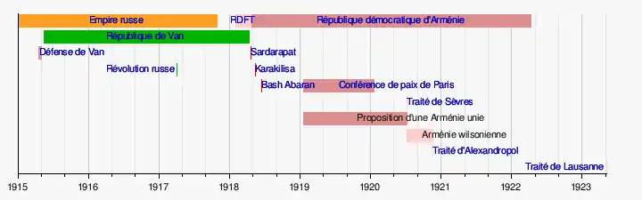 Pendant la Première Guerre mondiale, les Arméniens de l'Empire ottoman sont exterminés par le gouvernement durant le génocide arménien. Selon les estimations, sur la période allant de 1894 à 1923, entre 1 500 000 et 2 000 000 Arméniens sont tués[26]. Après que la décision de mettre en œuvre le génocide fut prise par le Ministre de l'Intérieur ottoman Talaat Pacha et exécuté au départ par la Directive 8682 le , des dizaines de milliers d'Arméniens de Russie rejoignent l'armée russe du Caucase au sein des unités de volontaires arméniens avec la promesse du gouvernement russe qu'ils obtiendraient leur autonomie. Jusqu'en 1917, la Russie contrôle une bonne partie des régions de l'Empire ottoman où les Arméniens sont nombreux. Cependant, après la Révolution d'Octobre, les troupes russes abandonnent le front du Caucase et laissent les troupes irrégulières arméniennes seules face à l'armée ottomane. Le Conseil national arménien proclame la République d'Arménie le , établissant ainsi un État arménien dans les provinces habitées par les Arméniens dans le Caucase du sud.
