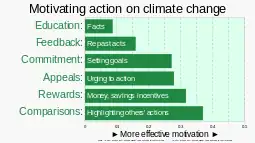 Ces trois méthodes ont été mises en œuvre dans des campagnes climatiques destinées au grand public. Les informations sur les impacts du changement climatique mondial jouent un rôle dans la formation des croyances, des attitudes et des comportements climatiques, tandis que les effets d'autres approches (par exemple, la fourniture d'informations sur les solutions au réchauffement climatique), l'élaboration d'un consensus, l'utilisation d'informations mécanistes) sont encore largement inconnus[14]. La troisième approche consiste à créer un espace de discussion qui dépasse les intérêts économiques qui dominent souvent les débats politiques, afin de mettre l'accent sur les valeurs écologiques et la démocratie directe. Cela a été considéré comme crucial pour provoquer des changements structurels plus importants[15]. Certains politiciens, comme Arnold Schwarzenegger à travers son slogan "mettre fin à la pollution", disent que les militants devraient générer de l'optimisme en se concentrant sur les co-bénéfices sanitaires de l'action climatique[16].