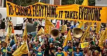 Partout dans le monde, des jeunes ont fait grève, plaidé et se sont portés volontaires pour des solutions climatiques. Des groupes de jeunes pour l'action climatique tels que SustainUS, Fridays for Future et le Sunrise Movement ont appelé les jeunes à tenir les dirigeants responsables, que ce soit en assistant à des conférences[78], en faisant la grève de l'école et en faisant pression sur les politiciens pour qu'ils écoutent les scientifiques[79], ou en appelant à davantage d'emplois verts et en consolidant le pouvoir électoral[80].