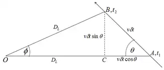 Supposons un jet relativiste qui se dirige à l'extérieur d'un noyau d'une galaxie active selon l'axe AB avec une vitesse v. L'observateur se trouve au point O. Au temps un rayon lumineux quitte le jet du point A et un autre rayon quitte le jet à un temps du point B. L'observateur au point O perçoit les deux rayons à des temps respectifs et . L'angle qui correspond au prolongement de la vision de l'observateur avec les points A et B. Considérant la distance du jet observé, les deux prolongements appelés peuvent être considérés comme égaux[13].